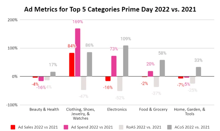 Across the top 5 categories, ACoS increased 49% when compared to Prime Day 2021, while RoAS increased 93%. The trend in upward movement shows despite the fierce competition many sellers faced advertising, those who increased their ad spend saw higher returns. Those who did NOT increase their ad spend also saw a bump in sales and impressions: