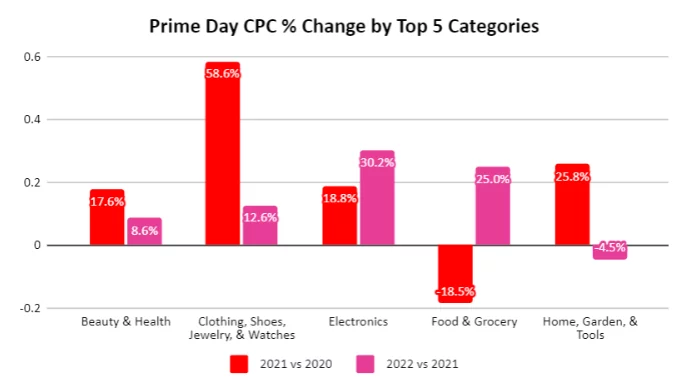 While normally a historically competitive selling period, Prime Day sales came at a much higher cost due to escalating costs per click (CPCs) and costs per impression (CPM). Across categories, CPCs increased by 123% for Amazon Prime Day 2022 compared to 2021, while they increased modestly, by 29%, in 2021 compared to 2020.
