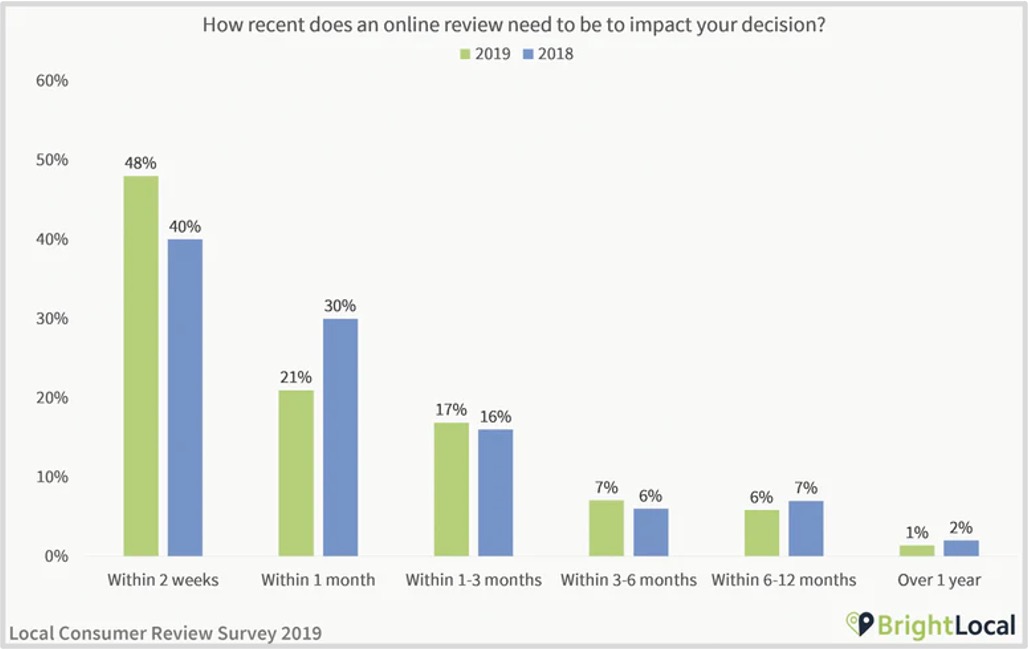 The majority (84%) of consumers believe that online reviews older than three months are no longer relevant, according to BrightLocal. As the chart portrays above, the value of product reviews decreases the older the review is. If a shopper is on the fence about purchasing a product between two brands who have a similar amount of reviews, the brand with the most recent reviews will likely gain the sale. Brands who have recent product reviews will stand out among their competitors and drive more shoppers to purchase their items